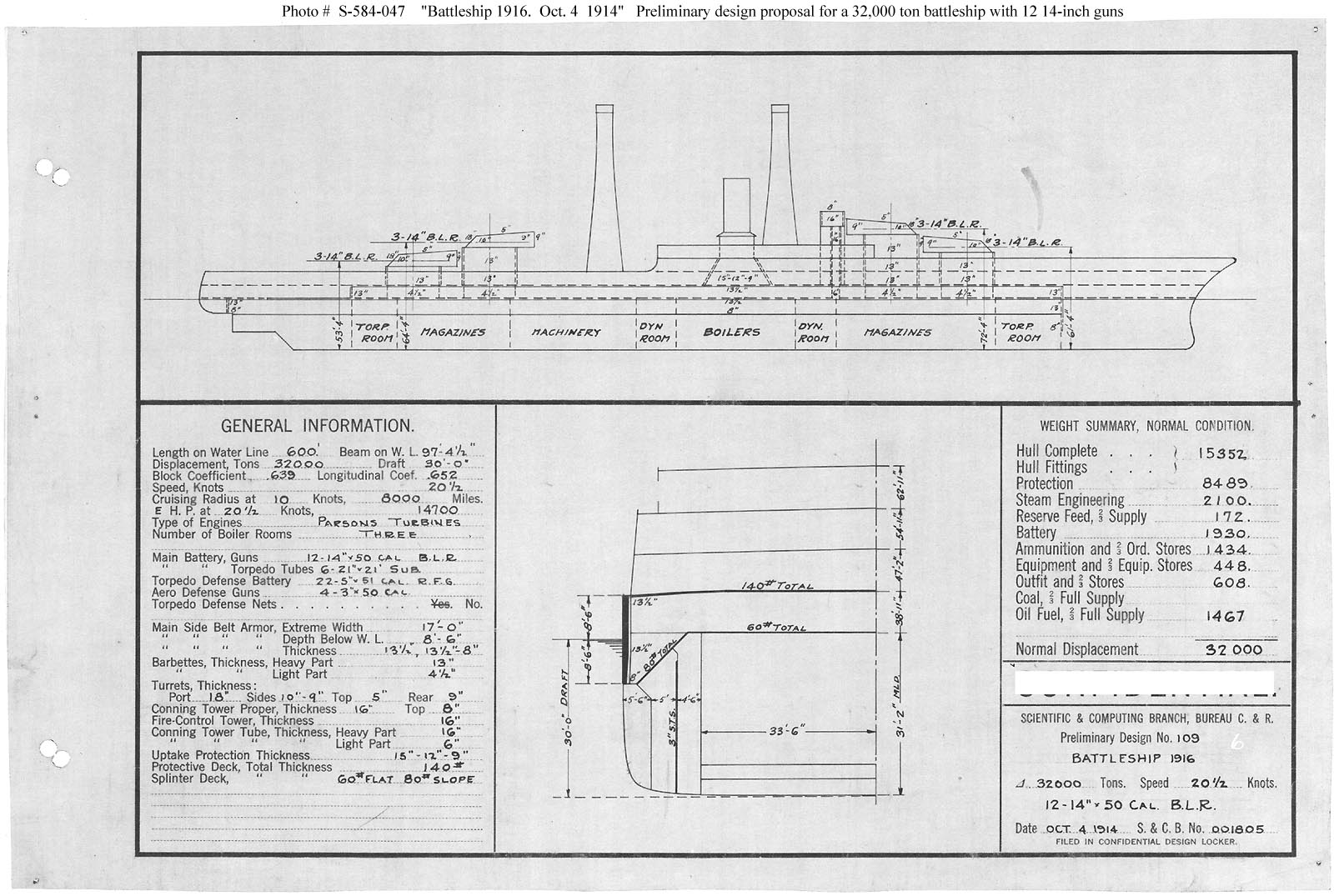 Photo #: S-584-047 "Battleship 1916" ... October 4, 1914 Design drawing illustrating a potential change to the features planned for Battleship # 43 of the Fiscal Year 1916 shipbuilding program. The Secretary of the Navy directed on 30 July 1914 that this design would be the same as the previous Battleship # 40 class (see Photo # S-584-044), except that speed would be reduced one-half knot to 20.5 knots. This drawing shows the side protection system of vertical bulkheads on each side widened by 4 feet 3 inches to a total of 15 feet and one additional vertical bulkhead added. The design was changed significantly, and finally, a month later to provide five vertical bulkheads inside the shell with the protective decks flat above them. This plan provides twelve 14-inch guns, turbine machinery, and a speed of 20.5 knots in a ship 600 feet long on the waterline, 97 feet 4.5 inches in beam, and with a normal displacement of 32,000 tons. Note: The original document was a blueprint (white on dark blue.) The original plan is in the 1911-1925 "Spring Styles Book". U.S. Naval History and Heritage Command Photograph. Online Image: 249KB; 1600 x 1075 pixels |