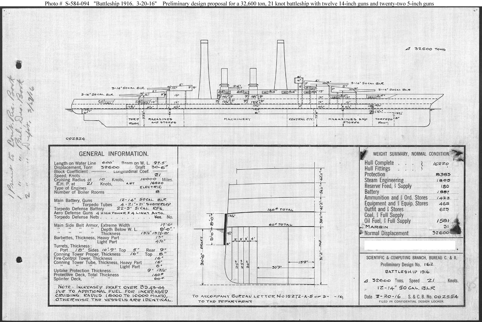 Photo #: S-584-094 Battleship 1916 ... March 20, 1916 The preliminary design for battleships to be funded in Fiscal Year 1916, sent by the Bureau of Construction & Repair on 28 March 1916 to the Navy Department as the baseline for comparison with six alternative new designs (see Photo #s S-584-095 through S-584-100) under consideration for construction in the forthcoming Fiscal Year 1917. Tennessee and California (Battleships No.43 and 44, respectively) were built with Fiscal Year 1916 funding to the design shown here. Note: The original document was a blueprint (white on black). The original plan is in the 1911-1925 "Spring Styles Book". U.S. Naval Historical Center Photograph. Online Image: 299KB; 1600 x 1070 pixels |