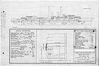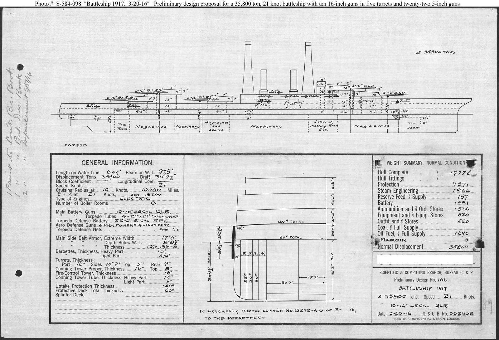 Photo #: S-584-098 Battleship 1917 ... March 20, 1916 A preliminary design for a battleship to be funded in Fiscal Year 1917, sent on 28 March 1916 to the Navy Department. This design generally followed the Tennessee, differing in replacing triple 14-inch gun turrets with twin 16-inch turrets while adding a fifth twin 16-inch gun turret aft. This design was the least risky means of providing ten 16-inch guns on a ship adapted from the Tennessee and was recommended by the Navys General Board to the Secretary of the Navy. Navy Secretary Josephus Daniels disagreed, directing instead the simplest 16-inch gun adaptation of the Tennessee design, Preliminary Design No.163 (see Photo #: S-584-095). This plan provided ten 16-inch guns, electric machinery, and a speed of 21 knots in a ship 644 feet long on the waterline, 97 feet 6 inches in beam, and with a normal displacement of 35,800 tons. Note: The original document was a blueprint (white on black). The original plan is in the 1911-1925 "Spring Styles Book". U.S. Naval Historical Center Photograph. Online Image: 292KB; 1600 x 1090 pixels |