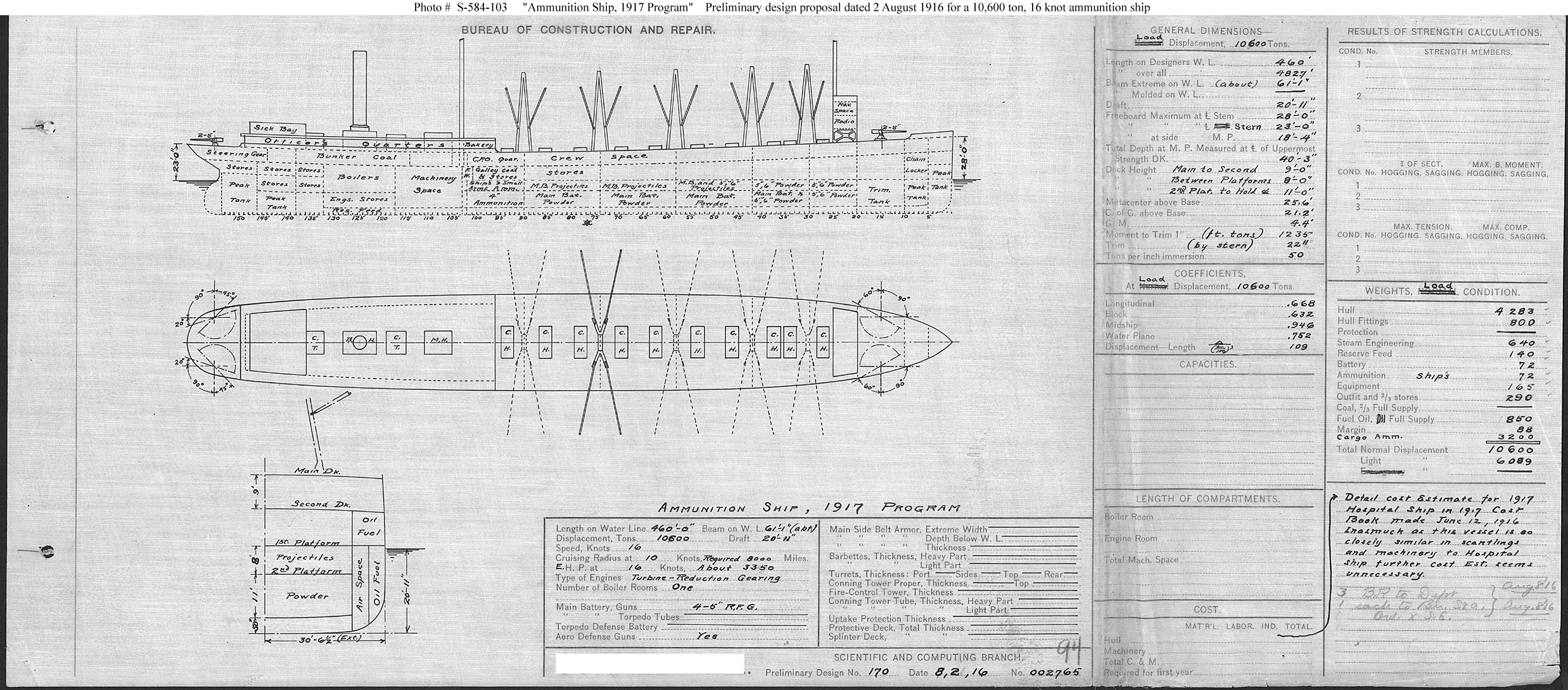 Photo #: S-584-103 Preliminary Design Plan for an Ammunition Ship for the Fiscal Year 1917 Shipbuilding Program... August 2, 1916 A preliminary design for an ammunition ship sent to the Secretary of the Navy for consideration in meeting the General Boards characteristics of 7 October 1915 for ammunition ships. The design adopted the general form of Henderson (Transport # 1, see Photo # S-584-077) but modified it by moving machinery aft to facilitate cargo storage, cooling, and handling. This design, with a few modifications, was used as the basis for construction of Pyro (Ammunition Ship # 1) and Nitro (Ammunition Ship # 2). This plan provides four 5-inch guns, turbine machinery for a speed of 16 knots, and an ammunition cargo capacity of 3,200 tons in a ship 460 feet long on the waterline, about 61 feet 1 inches in beam, and with a normal displacement of 10,600 tons. Note: The original document was ink on linen (black on white). The original plan is in the 1911-1925 "Spring Styles Book". U.S. Naval Historical Center Photograph. Online Image: 565KB; 2475 x 1090 pixels |