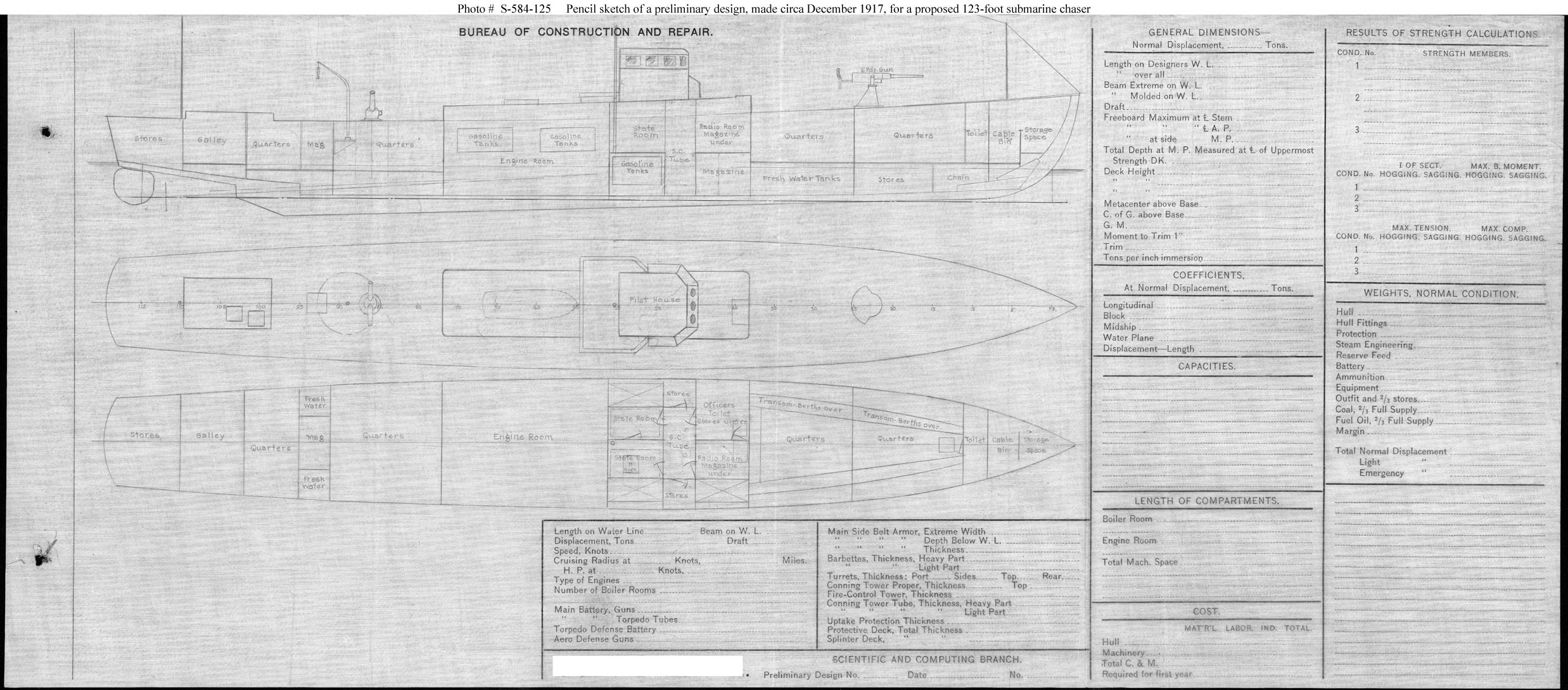 Photo #: S-584-125 Undated Draft Preliminary Design Plan for a 123-foot Submarine Chaser An undated rough draft for a preliminary design plan for a submarine chaser. This sketch appears to represent an initial layout for what became Preliminary Design No.188 (see Photo # S-584-124), a 118-foot design that was intended to be more seaworthy than the 105-foot (water line length) Submarine Chaser # 1 class design in production at the time. The key change was the addition of a depth charge projector and six 500-lb. depth charges, which added almost seven tons additional payload. (Some S. C. # 1 class ships later received a depth charge projector in place of their original 3-inch gun aft.) The design seen here retained the basic layout of the existing design, including placing some fuel tanks below officers living quarters amidships. Note: The original document was pencil on linen (black on white). The original plan is in the 1911-1925 "Spring Styles Book". U.S. Naval Historical Center Photograph. Online Image: 393KB; 2475 x 1090 pixels |