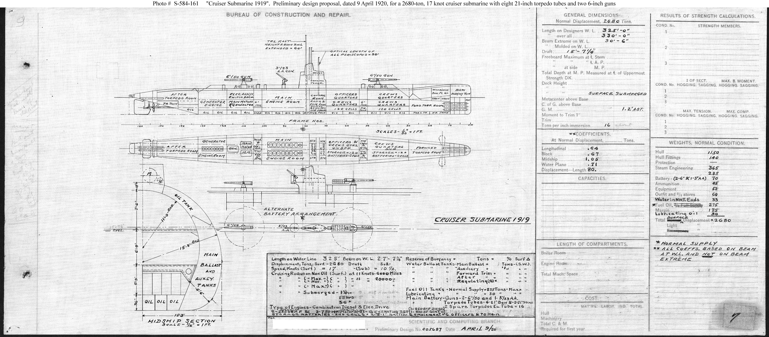 Photo #: S-584-161 Preliminary Design Plan for "Cruiser Submarine 1919" ... April 9, 1920 Preliminary design plan for a "Cruiser Submarine" for the Fiscal Year 1919 shipbuilding program. This concept was developed in response to draft characteristics circulated by the General Board and provided longer radius of action in a design modified from that proposed early in 1920 for a "fleet submarine" (see Photo # S-584-160), having a heavier gun armament and changed propulsion plant. Design development, initially inspired in part by the German U-142 class submarine, ultimately resulted in three large submarines typified by V-4 of the Fiscal Year 1925 program (see Photos # S-584-191 and S-584-195). This plan provided two 6-inch guns, diesel-electric machinery, and a surface speed of 17 knots in a ship 325 feet long on the waterline, 27 feet 7.25 inches in beam, and with a normal surface displacement of 2,680 tons. Note: The original document was ink on linen (black on white). The original plan is in the 1911-1925 "Spring Styles Book". U.S. Naval History and Heritage Command Photograph. Online Image: 458KB; 2475 x 1085 pixels |