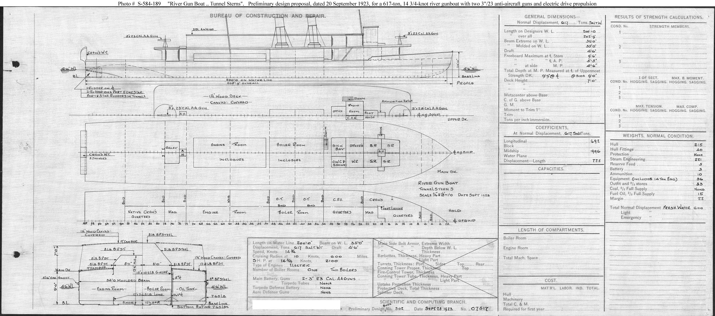 Photo #: S-584-189 "River Gunboat--Tunnel Sterns" ... September 28, 1923 Preliminary design plan for a river gunboat for operation in Chinese waters. This drawing represents one of a series of alternative designs undertaken to provide a design for ships intended to be built under the Fiscal Year 1924 building program. This design was based on an electric drive machinery plant intended to have high reliability as prescribed by the Bureau of Engineering. This plan provided for propellers aft inside tunnels and increased beam to keep draft to 4 feet 6 inches. This design was passed over in favor of one incorporating lighter modern machinery (see Photo # S-584-193). This plan provided two 3-inch guns, electric drive machinery, and a speed of 14.75 knots in a ship 200 feet long on the waterline, 35 feet in beam, and with a normal displacement of 600 tons in fresh water. Note: The original document was ink on linen (black on white). The original plan is in the 1911-1925 "Spring Styles Book". U.S. Naval History and Heritage Command Photograph. Online Image: 452KB; 2475 x 1095 pixels |