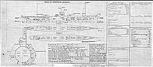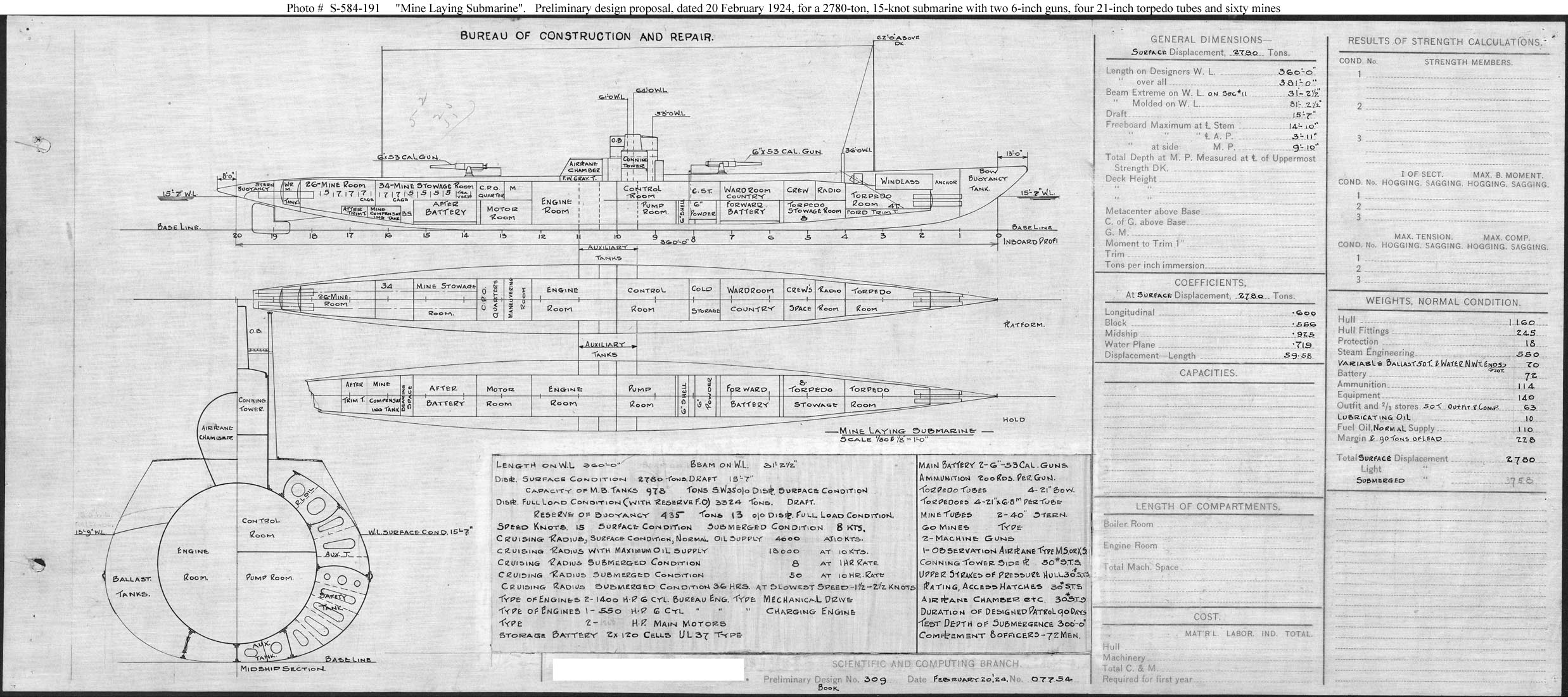 Photo #: S-584-191 Preliminary Design Plan for a "Mine Laying Submarine" ... February 20, 1924 Preliminary design plan for a "Mine Laying Submarine". The Secretary of the Navy approved this plan on 10 May 1924 for use in developing the working drawings for a fleet submarine authorized for construction in Fiscal Year 1925. The preliminary design seen here was modified significantly following receipt of comments on the design, including the results of a conference held on 24 June 1924 at the Submarine Base, New London, CT. It was recast as seen in Photo # S-584-195. One ship, V-4 (SF-7, reclassified as SM-1 on 24 July 1924 and renamed Argonaut on 19 February 1931) was built to the final design. This plan provides two 6-inch guns, diesel-electric machinery, and a surface speed of 15 knots in a ship 360 feet long on the waterline, 31 feet 2.5 inches in beam, and with a normal surface displacement of 2,780 tons. Note: The original document was ink on linen (black on white). The original plan is in the 1911-1925 "Spring Styles Book". U.S. Naval History and Heritage Command Photograph. Online Image: 456KB; 2475 x 1100 pixels |