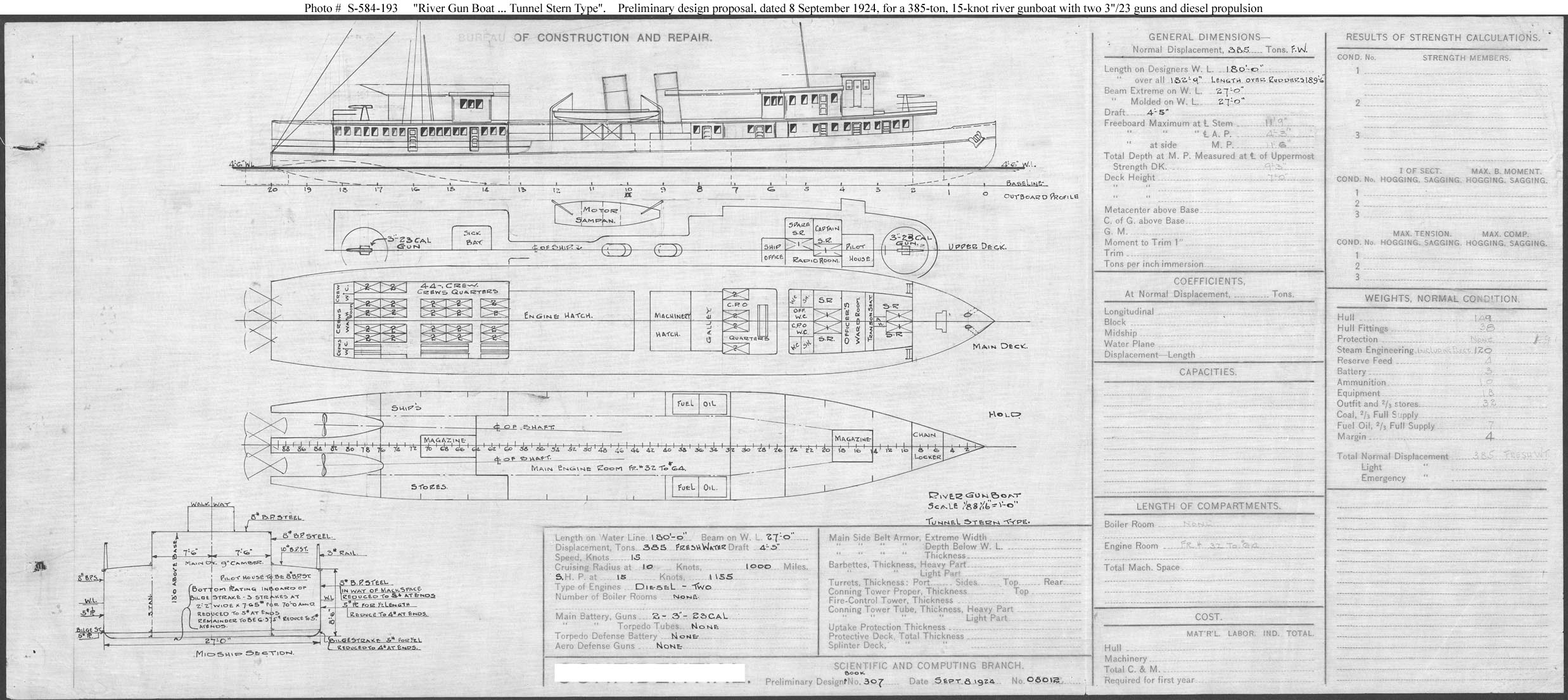 Preliminary design plan for a river gunboat for operation in Chinese waters.