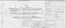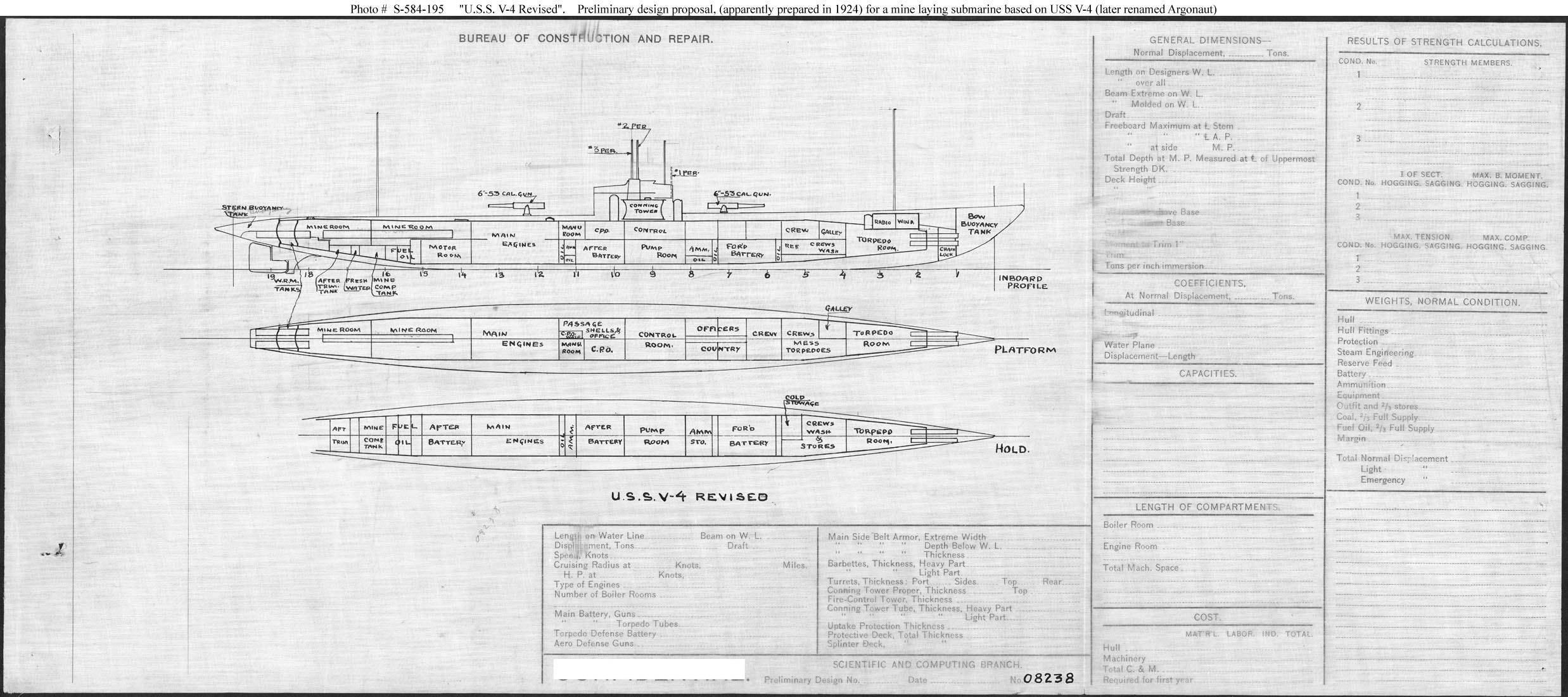 Photo #: S-584-195 Undated Design Plan "U. S. S. V-4 Revised" ... Undated design plan for minelaying submarine V-4 (SM-1). This drawing reflects a set of design changes that were approved on 9 October 1924 by the Secretary of the Navy for use in building this ship. The preliminary design approved in May 1924 (see Photo # S-584-191) was modified by omission of the aircraft hangar, lowering the bridges in the sail about four feet, shifting the main engines and motors aft, moving the after batteries forward, and adding a range finder and a small after magazine for the main battery guns, among other things. (V-4 was renamed Argonaut on 19 February 1931.) This drawing includes no data on ship characteristics (see Photo # S-584-191 for characteristics as approved in the earlier preliminary design.) Note: The original document was ink on linen (black on white). The original plan is in the 1911-1925 "Spring Styles Book". U.S. Naval History and Heritage Command Photograph. Online Image: 347KB; 2475 x 1100 pixels |