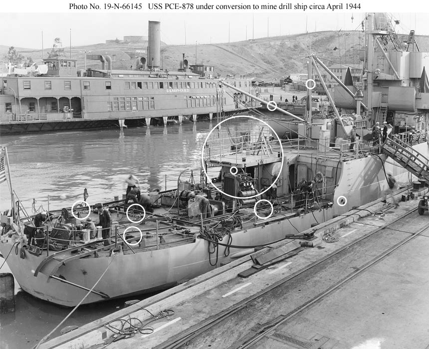Shortly after her arrival at the Mare Island Navy Yard circa March 1944 for conversion to a Drill Mine Laying and Recovery Vessel.
