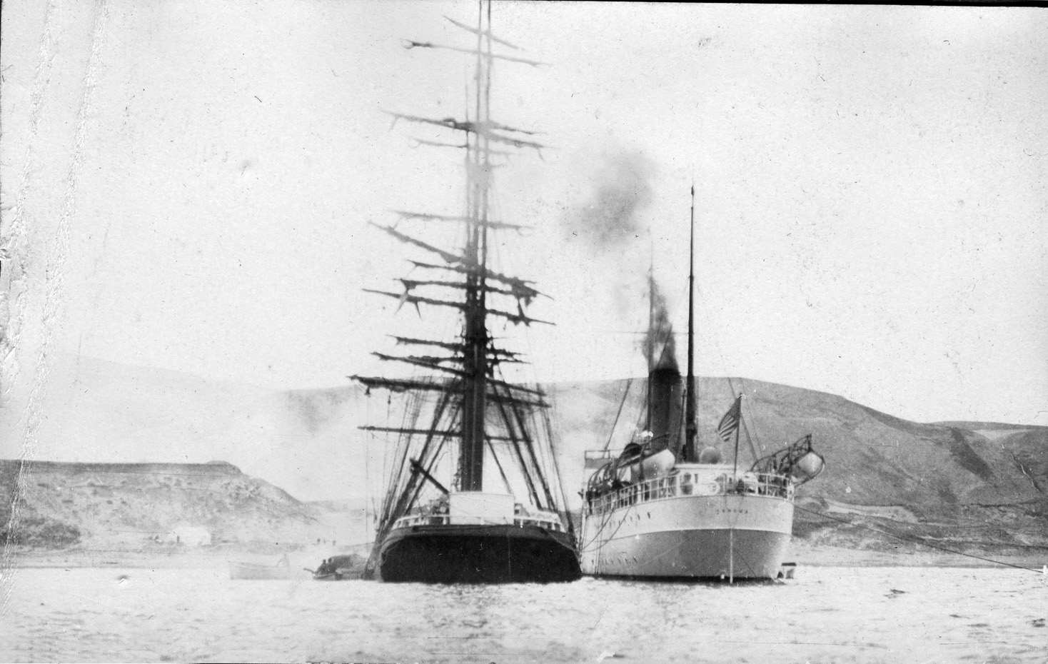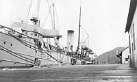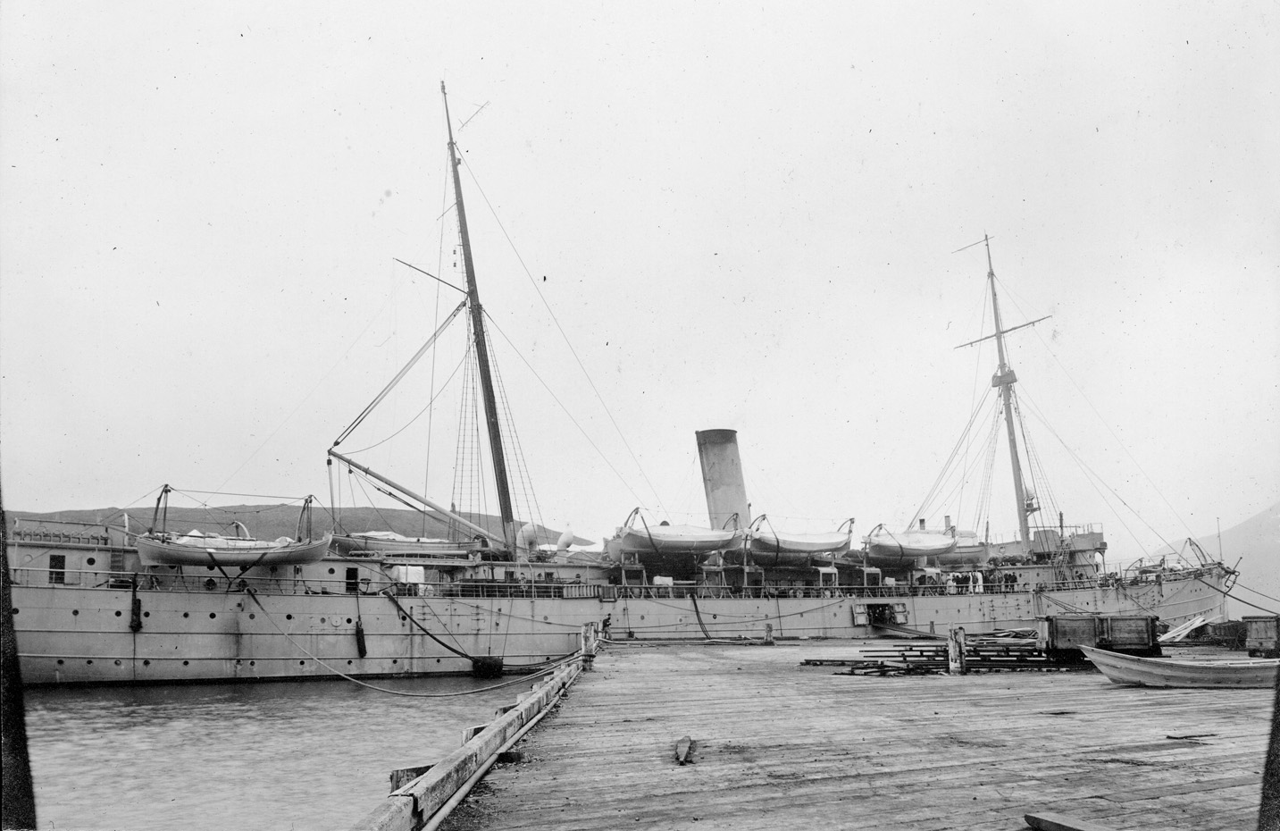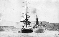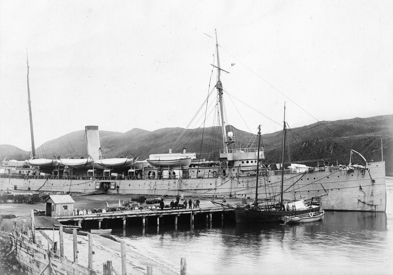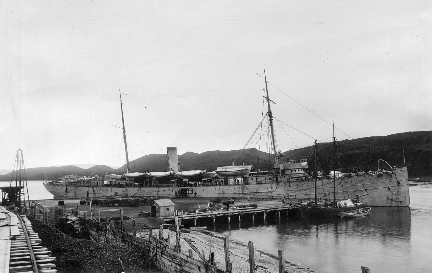Note the coal train on the pier in the background. The worn paint around the ship's bow is evidence of the many times that she had to use her anchors during the expedition.