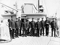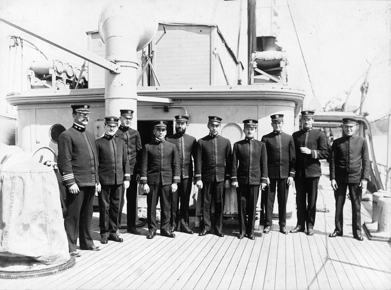 Photo #: NH 105463 USS Buffalo (1898-1927, later AD-8) The ship's officers posing on the main deck near the stern during the 1914 Alaskan Radio Expedition. The ship's Commanding Officer, Commander Montgomery M. Taylor, USN, is on the left. Collection of Admiral Montgomery M. Taylor, donated by Louisa R. Alger, 1962 (NHF-164-B). U.S. Naval Historical Center Photograph. |