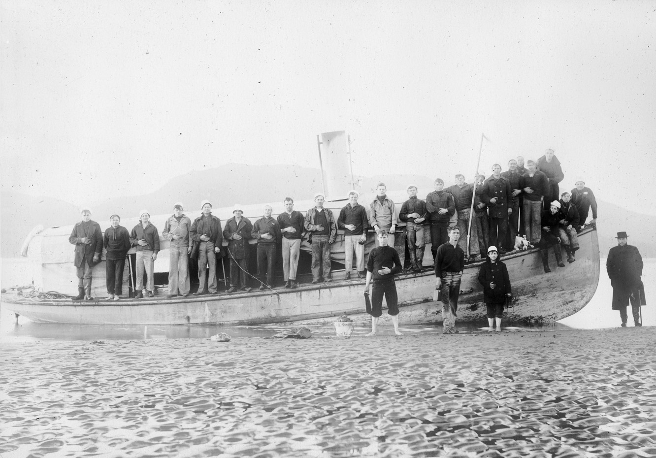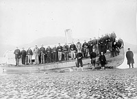 Photo #: NH 105468 USS Buffalo (1898-1927, later AD-8) Sailors posing on one of the ship's steam launches during the 1914 Alaskan Radio Expedition. The launch has been run up on the beach. The group may be one of the divisions that operated the ship's numerous boats. It may also include some of the civilian personnel embarked on the expedition. Collection of Admiral Montgomery M. Taylor, donated by Louisa R. Alger, 1962 (NHF-164-B). U.S. Naval Historical Center Photograph. |