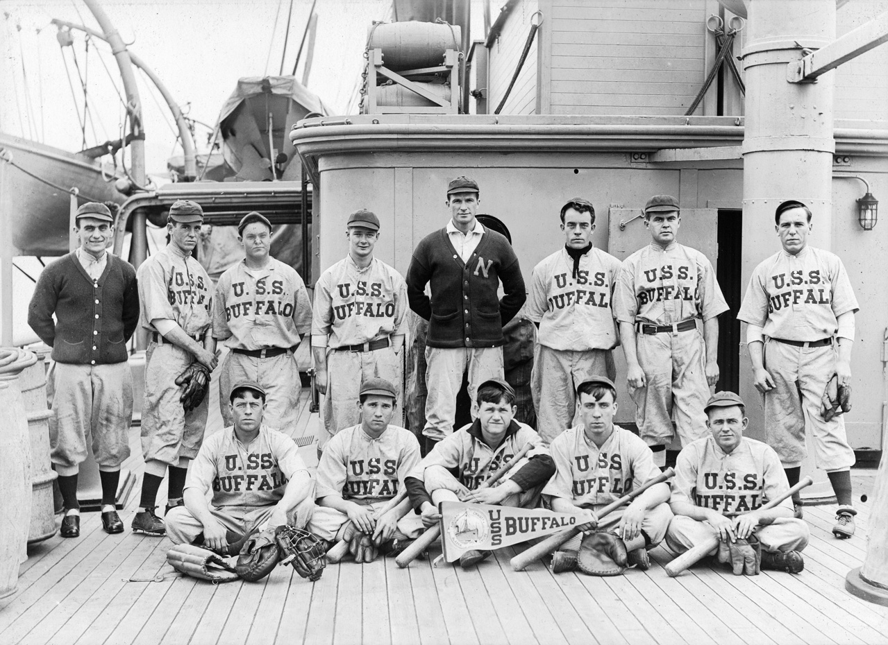 Photo #: NH 105469 USS Buffalo (1898-1927, later AD-8) The ship's baseball team posing on the main deck near the stern during the 1914 Alaskan Radio Expedition. Collection of Admiral Montgomery M. Taylor, donated by Louisa R. Alger, 1962 (NHF-164-B). U.S. Naval Historical Center Photograph. |