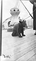 Photo #: NH 105596 USS Buffalo (1898-1927, later AD-8) "Teddy," a ship's mascot, on the ship's forecastle circa mid-1914 during the 1914 Alaskan Radio Expedition. "Teddy," probably an Alaskan bear cub, is also shown posing with one of the ship's divisions in Photo # NH 105464 above. Note the ship's capstain in the background. Collection of Admiral Montgomery M. Taylor, donated by Louisa R. Alger, 1962 (NHF-086). U.S. Naval Historical Center Photograph. |