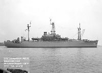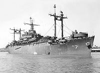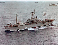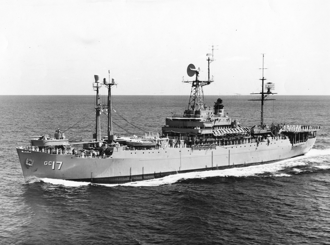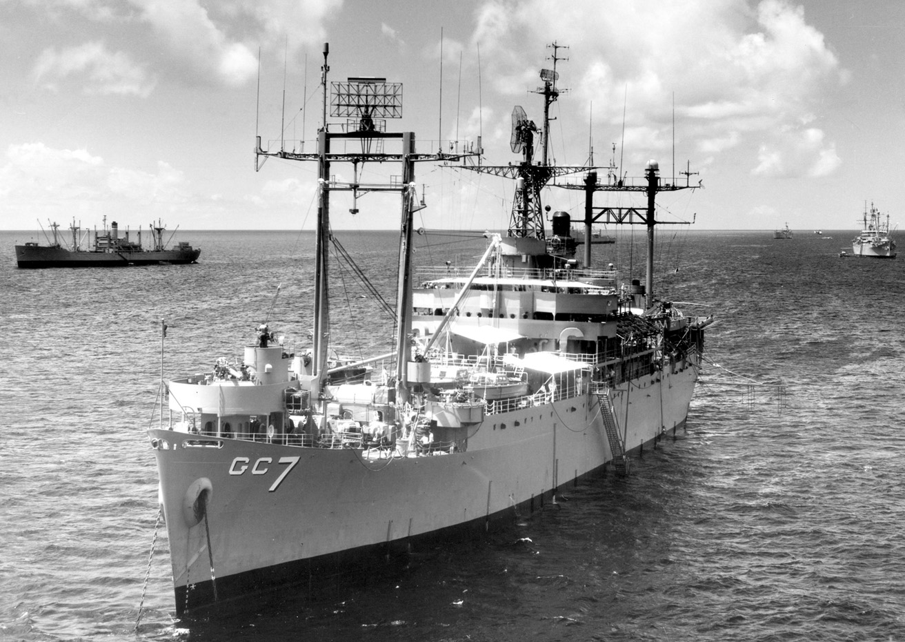 Off Vieques Island, Puerto Rico, in 1962 during Exercise PHIBLANTEX 1-62. Note the plethora of antennas on her masts. Each ship of this class developed over time a different configuration of antennas. The ship in the upper left is a MSTS Victory ship.