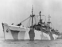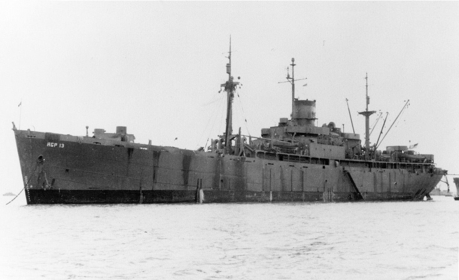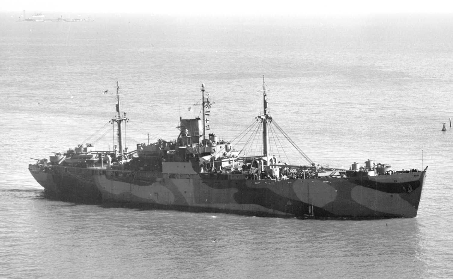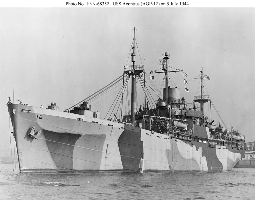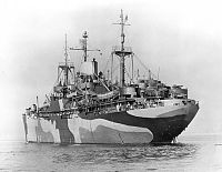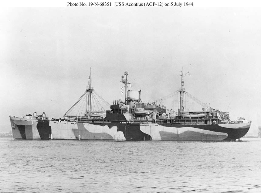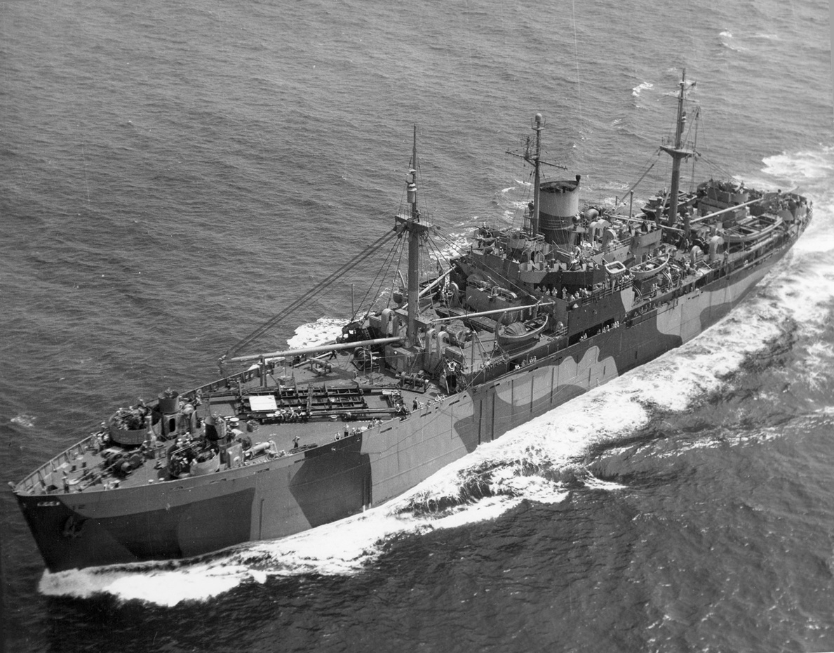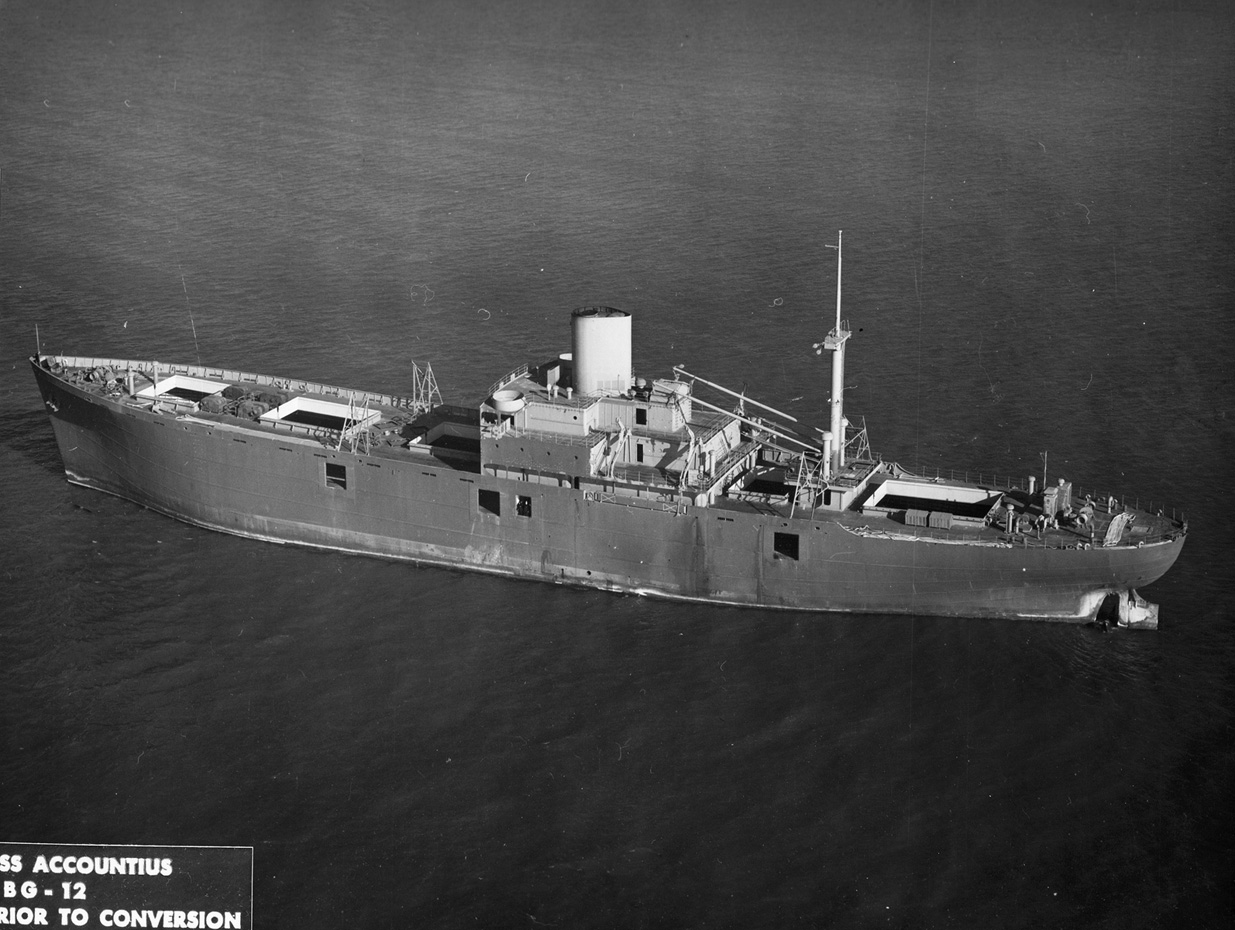 On 24 December 1943 enroute to the conversion yard, two days after delivery to the Navy by the Maritime Commission and the builder. Features not required in the conversion to AGP--including the entire merchant ship rig forward of the bridge--were omitted by the builder.