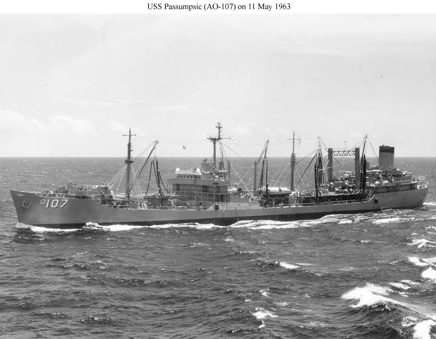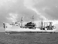 Rigged for fueling to port, date unknown. Note the armament of 4-3"50 guns and the refueling goalpost aft.