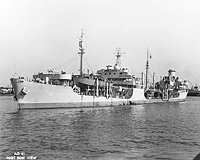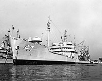 Photographed circa 1955 with an armament of two 3"/50, two quadruple 40mm, and four 20mm twin mounts.