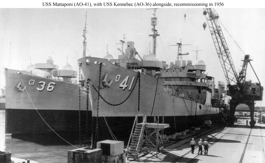Beginning to recommission in 1956 for the Suez crisis with USS Kennebec (AO-36) alongside.