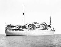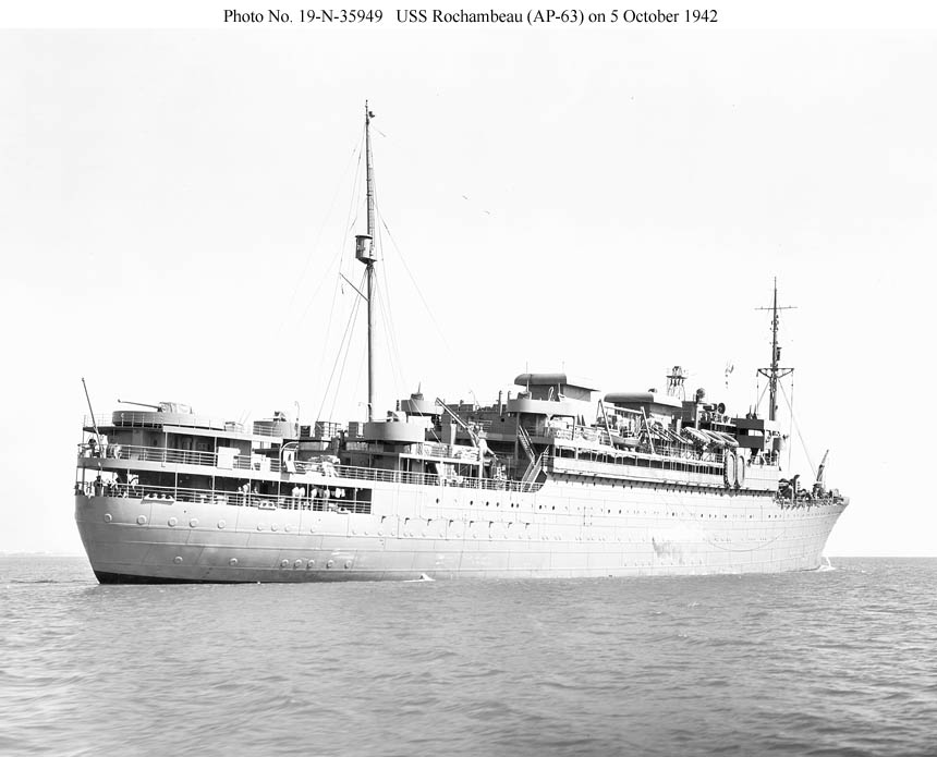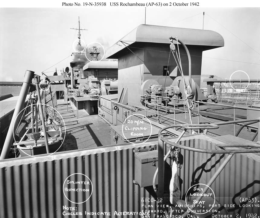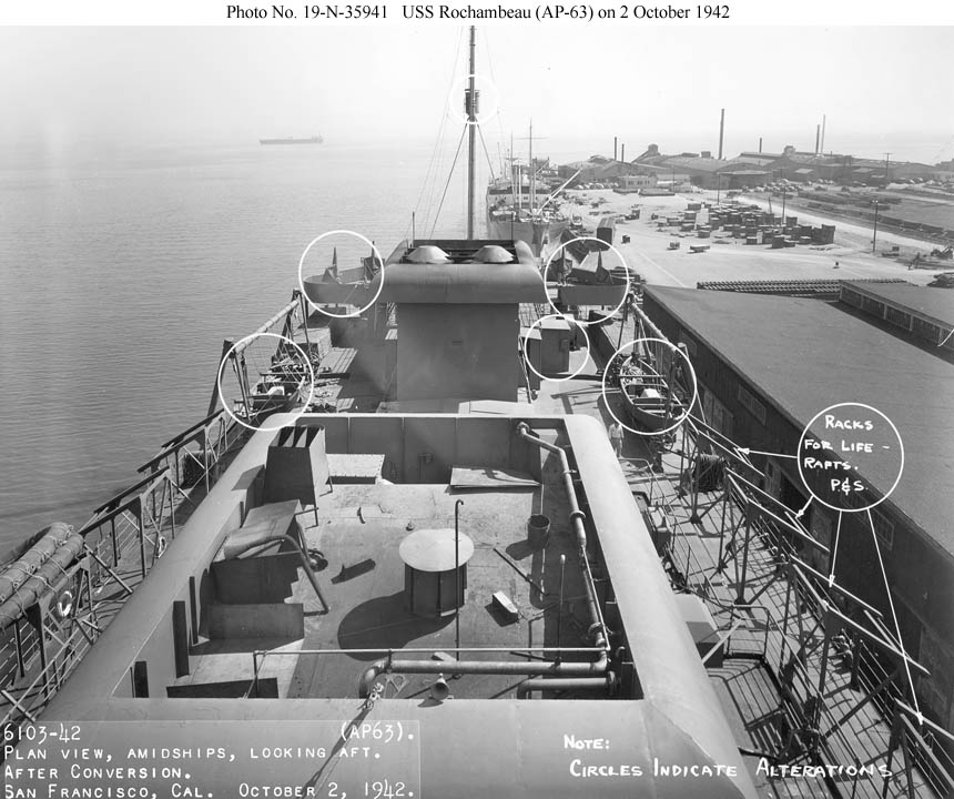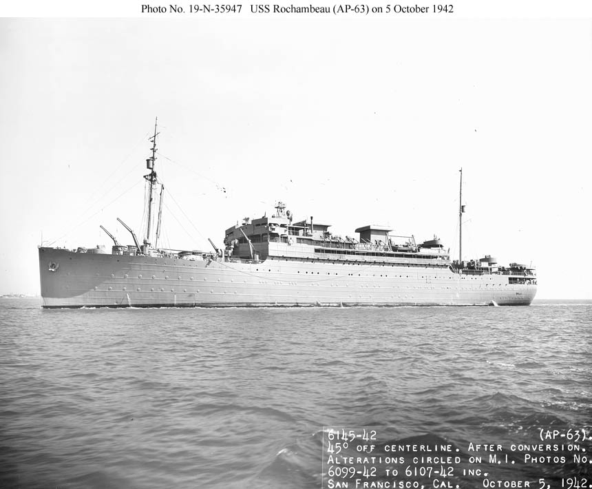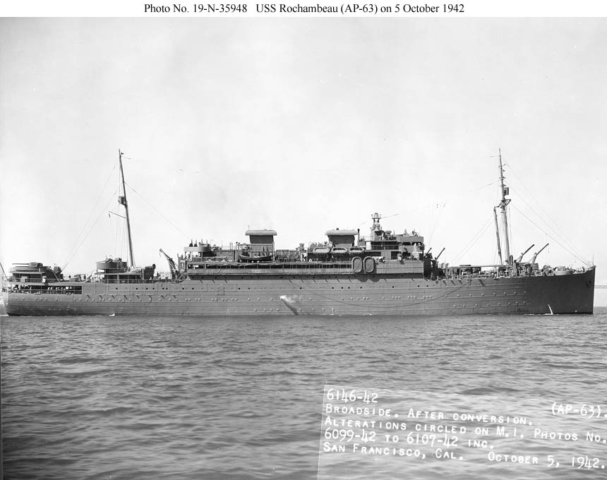 At the Mare Island Navy Yard on 2 October 1942 following conversion. This view shows some features added during conversion and the distinctive rectangular smokestacks favored by her French owner, the Messageries Maritimes line, for its diesel-propelled liners.