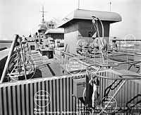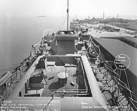 At the Mare Island Navy Yard on 2 October 1942 following conversion. This image shows some conversion features and the configuration of the tops of her unusual rectangular smokestacks.