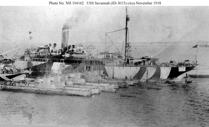 In disruptive camouflage circa late 1918, possiby after arriving at Charleston, S.C. for repairs on 13 December 1918 following her wartime voyage to the Azores.