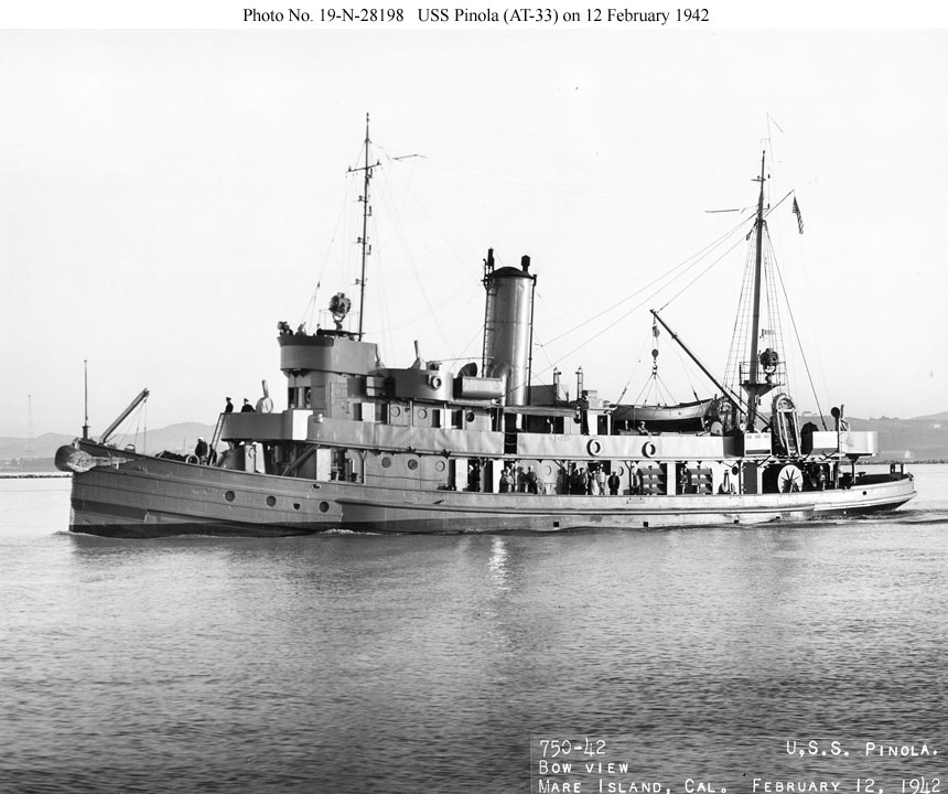 Early in World War II most of this class received four small anti-aircraft guns, initially .50 caliber machine guns as shown here and later 20mm Oerlikons. Pinola's gun arrangement, with single tubs fore and aft, was unusual. Note also the hull bulge, fitted in late 1941 to improve stability.