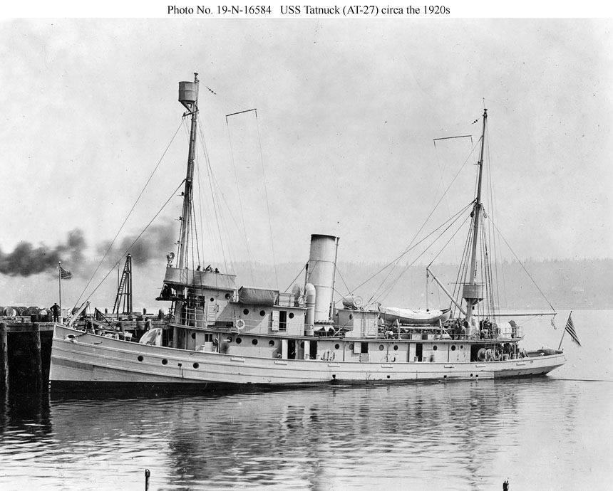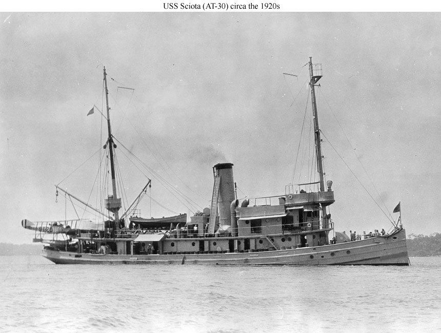 Sciota was assigned to the 15th Naval District in the Canal Zone from 1920 to 1933, when she was laid up at Philadelphia until 1940. Although not assigned to aviation duty, she is here carrying an aircraft that may have been based at the Coco Solo Naval Air Station. The side number on the aircraft is 8-T-20.