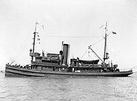 This tug retains her original heavy foremast but has received four small AA guns (probably .50 caliber machine guns, soon replaced with 20mm weapons), two forward and two aft.