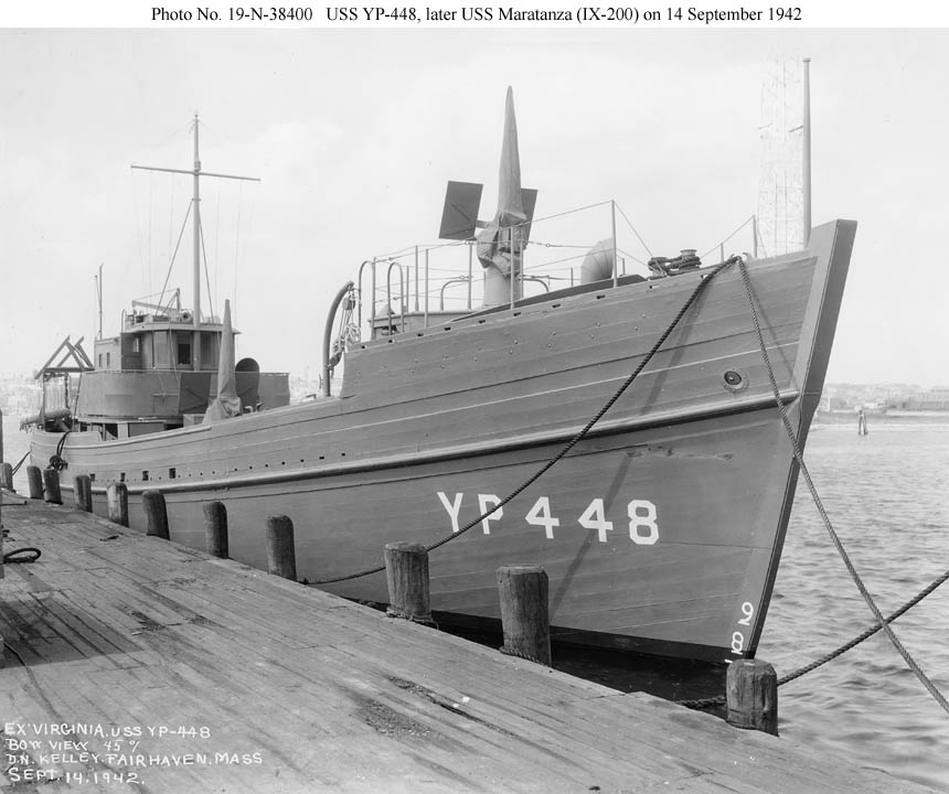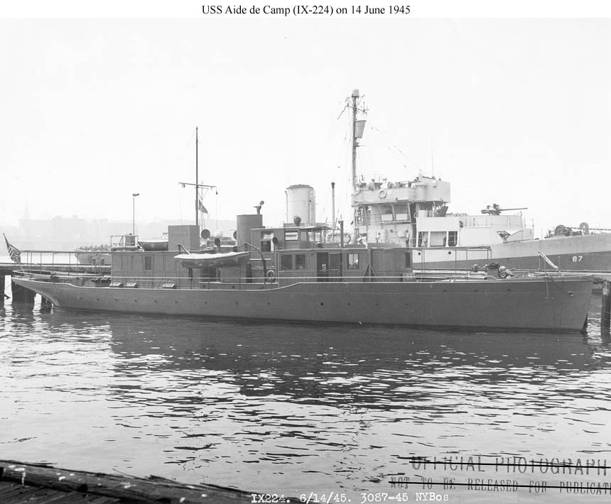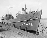 In the background is USS Alacrity (PG-87), formerly the British flower class corvette Cornel.