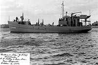 At the yard of D. N. Kelley, Fairhaven, Mass., on 14 September 1942 after being fitted out with special mine warfare devices.