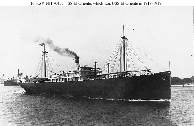 S.S. El Capitan, a 10,200 ton (displacement) freighter, was built at Newport News, Virginia, in 1917. She was turned over to the Navy in March 1918 and commissioned as USS El Capitan (ID # 1407). The ship served with the Naval Overseas Transportation Service during and shortly after World War I, making four voyages to France and England with military supplies and other cargo. El Capitan was decommissioned at the beginning of February 1919 and returned to her owner, the Southern Pacific Steamship Company.