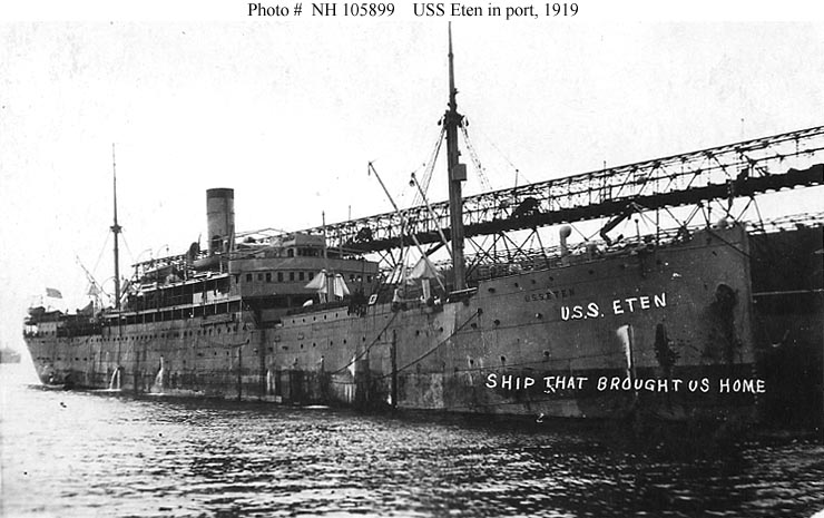 Rhakotis, a 6982 gross ton passenger steamship, was built at Hamburg, Germany, in 1907 and was taken over and renamed by the U.S. Shipping Board in 1917. She was acquired by the Navy from the Shipping Board at the beginning of May 1919 and placed in commission at that time as USS Eten (ID # 4041). Between late May and late July 1919 she was employed as a troop transport by the Cruiser and Transport Force, making two voyages to bring U.S. service personnel home from Europe. Decommissioned in mid-August 1919, Eten was then returned to the Shipping Board.