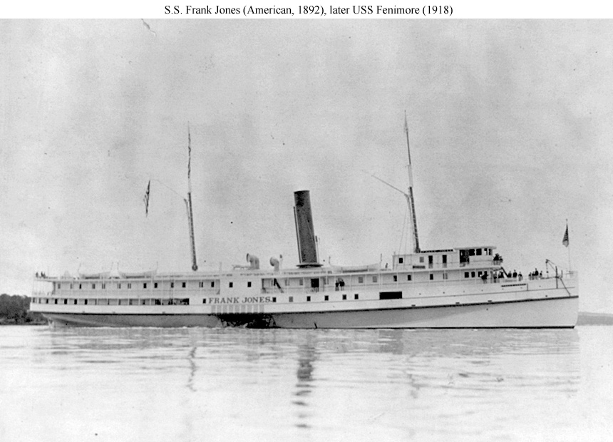 The 1634 gross ton sidewheel paddle steamer Frank Jones was launched on 26 March 1892 by the New England Shipbuilding Co. at Bath, Maine with engines by the Bath Iron Works for service on the Maine coast. In 1905 she moved to Long Island Sound, and in 1908 she moved again to the Hudson River. She was renamed Fenimore in 1915 and was laid up pending sale.