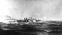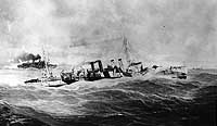 Photo #: NH 42691 USS Kimberly (Destroyer # 80) Painting by Burnell Poole, 1926, depicting Kimberly escorting USS Leviathan (in left distance) in the Atlantic war zone, 1918. USS Davis (Destroyer # 65) is in the right distance. Photographed circa the 1930s. Courtesy of the U.S. Navy Art Collection, Washington, D.C. U.S. Naval Historical Center Photograph. Online Image: 65KB; 740 x 455 pixels Note: By the early 1970s this painting's condition had greatly deteriorated. See Photo # NH 42691-A-KN for its appearance at that time. |
