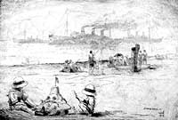 Photo #: NH 1050 USS Stevens (Destroyer # 86) Painting by Burnell Poole, 1924, depicting Stevens escorting USS Leviathan (ID # 1326) in the Atlantic, 1918. Another destroyer is in the right distance. This photograph was taken circa the 1920s or 1930s. U.S. Naval Historical Center Photograph. Online Image: 64KB; 740 x 445 pixels |