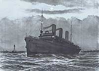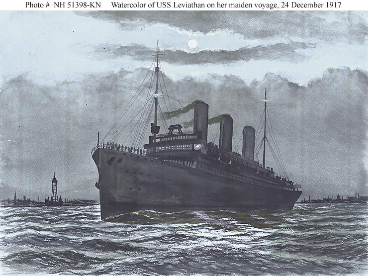 Photo #: NH 42690-KN "A Fast Convoy" Oil painting by Burnell Poole, depicting USS Allen (Destroyer # 66) escorting USS Leviathan (ID # 1326) in the War Zone, 1918. The original painting measures 60" x 33". Courtesy of the Naval Historical Foundation, Washington, D.C. U.S. Naval Historical Center Photograph. Online Image: 50KB; 740 x 420 pixels Note: See Photo # NH 42690-KN (extended caption) for the artist's comments on this painting. |