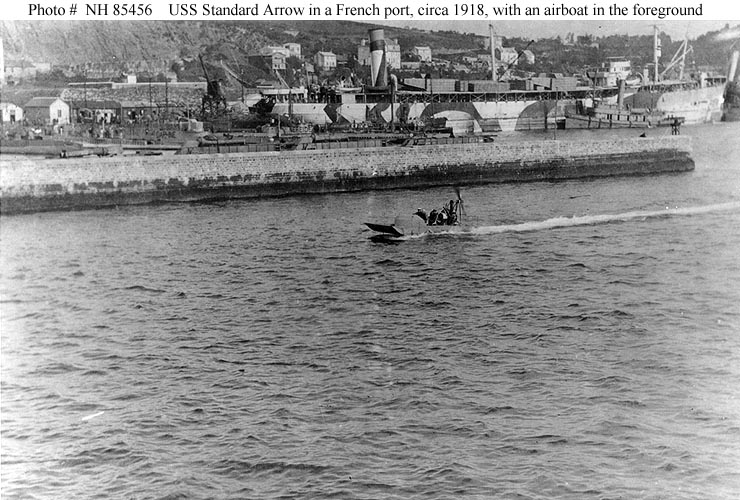 USS Standard Arrow, a 7794 gross ton oiler, was built at Camden, New Jersey, in 1916 as the U.S. flag commercial tanker Standard Arrow. She was chartered by the Navy after the United States entered World War I and, after fitting out, was placed in commission at Mare Island, California, in August 1917. During the rest of the conflict she made several voyages between the Western Hemisphere and ports in the European war zone, transporting fuel oil and other supplies. This work was interrupted on 4 February 1918, when she collided with the tanker Norman Bridge. Repairs kept her in a U.S. shipyard until March, when she resumed her normal trans-Atlantic logistics operations. USS Standard Arrow completed her last Navy voyage in December 1918 and was turned over to the Shipping Board late in the next month. She was returned to her owner in February 1919.