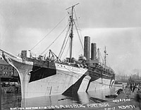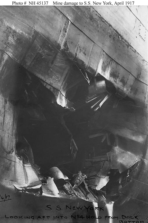 Photo #: NH 45137 S.S. New York (American Passenger Liner, 1888) Mine damage to the ship's port side, forward, received on 9 April 1917, while she was approaching Liverpool, England, at the end of a trans-Atlantic trip. Photographed by H. Dowden on 12 April, while New York was in drydock at Liverpool. The view looks aft from the dock's floor. U.S. Naval History and Heritage Command Photograph. Online Image: 73KB; 510 x 765 pixels |