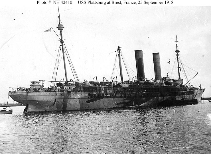 Photo #: NH 42410 USS Plattsburg (ID # 1645) At Brest, France, 23 September 1918. Built in 1888 as the passenger liner City of New York and later renamed New York, this ship briefly served as USS Harvard between 26 April and 2 September 1898. On 9 May 1918, following employment as a civilian-operated troop transport, S.S. New York was chartered by the Navy and, on 24 May 1918, placed in commission as USS Plattsburg. She was returned to her owners on 6 October 1919. U.S. Naval History and Heritage Command Photograph. Online Image: 98KB; 740 x 540 pixels |