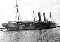 S.S. City of New York, a 10,499 gross ton passenger steamer, was built at Glasgow, Scotland, in 1888. A sister of the S.S. City of Paris, and of equally striking appearance with three smokestacks and a "clipper" bow, she operated between the United Kingdom and the United States under the British merchant flag until 1893, when she was transferred to U.S. registry and renamed New York. Her commercial activities remained as before until April 1898, when she was chartered by the U.S. Navy for Spanish-American War service. Converted to an auxiliary cruiser and renamed Harvard, she was placed in commission in late April and served thereafter on scouting duties in the Caribbean and as a transport. During the 3 July 1898 naval battle off Santiago, Cuba, she rescued more than 600 survivors of wrecked Spanish warships. After carrying U.S. troops home from Cuba, Harvard was decommissioned in September 1898 and returned to her owners.