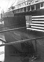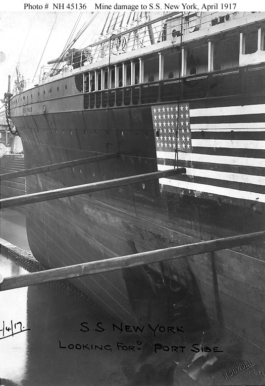 Photo #: NH 45136 S.S. New York (American Passenger Liner, 1888) In drydock at Liverpool, England, on 12 April 1917, showing mine damage received on 9 April, while she was approaching Liverpool at the end of a trans-Atlantic trip. Among the ship's passengers on this voyage was Rear Admiral William S. Sims, USN, who was assigned to the British Admiralty as the U.S. Navy's representative. Note the large hole in New York's hull side below the waterline, the U.S. flag neutrality marking (the United States had entered World War I after the ship began this trip), and her forward port side deck gun. Photographed by H. Dowden. U.S. Naval History and Heritage Command Photograph. Online Image: 80KB; 525 x 765 pixels |