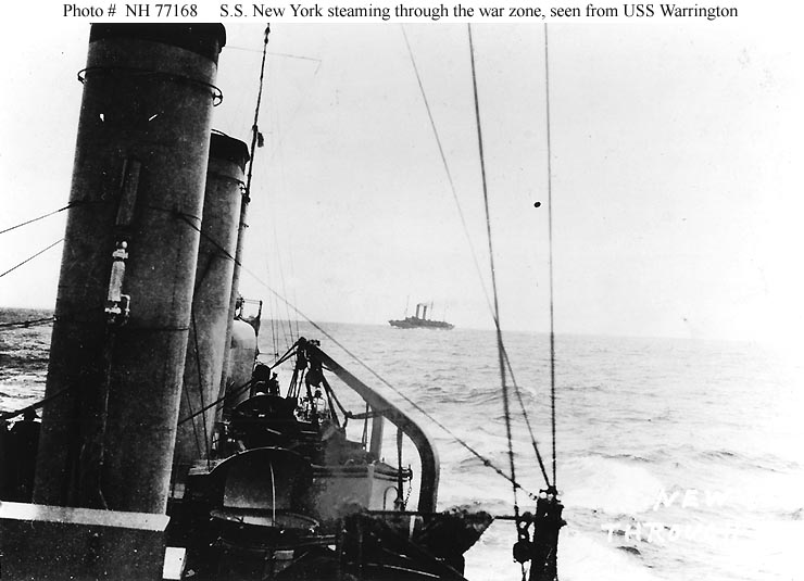 Photo #: NH 77168 S.S. New York (American Passenger Liner, 1888) Steaming through the war zone while operating as a troop transport in 1917 or early 1918. Photographed from on board USS Warrington (Destroyer # 30), which was escorting the transport as she approached the end of a trans-Atlantic voyage from the United States. Courtesy of Gustavus C. Robbins, 1973. U.S. Naval History and Heritage Command Photograph. Online Image: 63KB; 740 x 535 pixels |