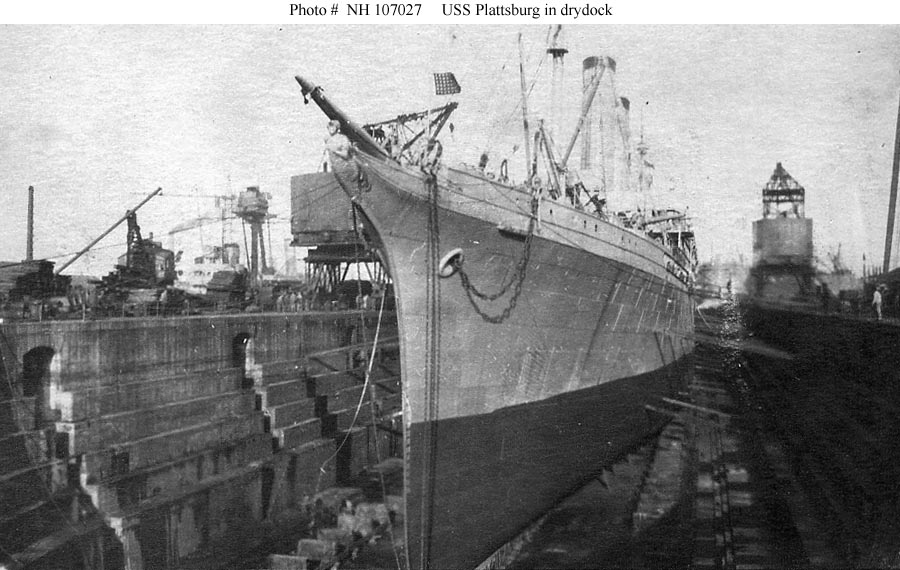 Photo #: NH 107027 USS Plattsburg (ID # 1645) In drydock, 1919. The original image is printed on a post card mailed in May 1919. Donation of Dr. Mark Kulikowski, 2010. U.S. Naval History and Heritage Command Photograph. Online Image: 105KB; 900 x 570 pixels |