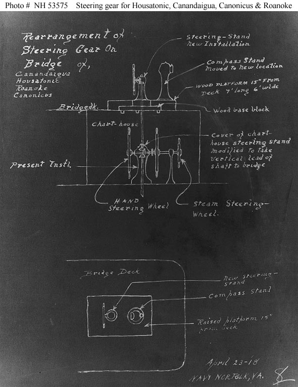Photo #: NH 53575 USS Canandaigua (ID# 1694); USS Roanoke (ID # 1695); USS Canonicus (ID # 1696); and USS Housatonic (ID # 1697) Sketch of "Rearrangement of Steering Gear" on ships' bridges, made at the Norfolk Navy Yard, Virginia, 23 April 1918. U.S. Naval History and Heritage Command Photograph. Online Image: 81KB; 590 x 765 pixels |