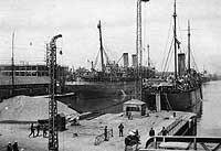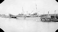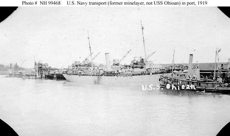 USS Housatonic, a 7620-ton (displacement) minelayer, was built at Newport News, Virginia, in 1899 as the 4664 gross ton commercial passenger-cargo ship El Rio. She was taken over by the Navy late in 1917, renamed, placed in commission in January 1918 and converted to a minelayer. Once this work was completed Housatonic steamed across the Atlantic to Scotland, from which she operated for the rest of World War I helping to build a barrier of mines across the North Sea in an effort to restrict the movements of German submarines. The ship returned to the U.S. following the November 1918 Armistice and was converted to a troop transport. She was then employed by the Cruiser and Transport Force to bring American servicemen home from France. Housatonic was decommissioned in early August 1919 and returned to her owner, the Southern Pacific Steamship Company.