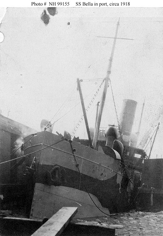 USS Bella, a 1272 gross ton cargo ship, was built at Newcastle, England, in 1906. In February 1918, while in commercial service as S.S. Bella, she was purchased by the Navy. Placed in commission in mid-March at Paulliac, France, she was employed as a support ship for Navy aviation units in Europe for the rest of World War I and for the first three months following the November 1918 Armistice. In February 1919, though remaining in Navy service, Bella began working for the U.S. Army, carrying cargo on the Gironde River, France. Returning to the United States in November 1919, she was decommissioned in February 1920 and sold in August of that year.