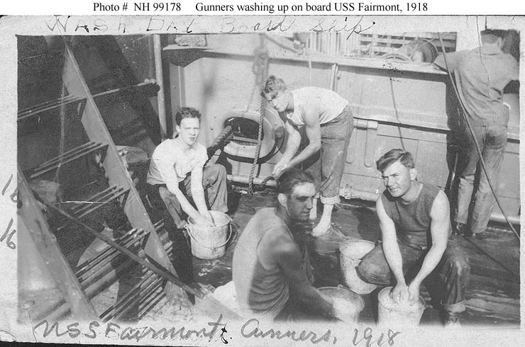 Some of the ship's gunners during a wash day on board, 1918.