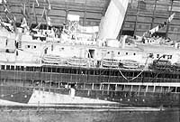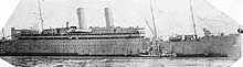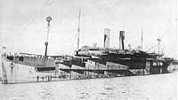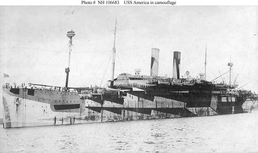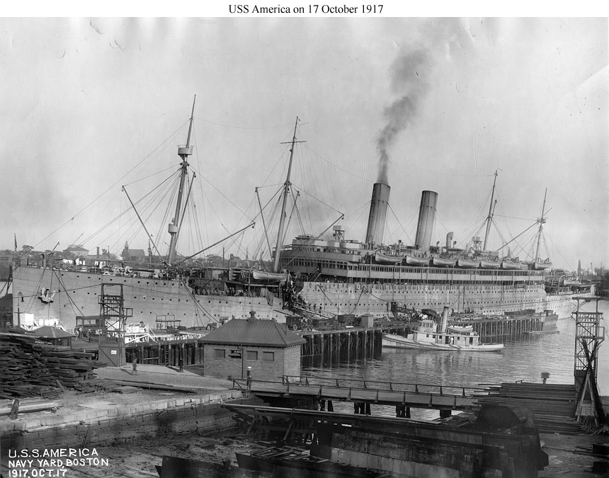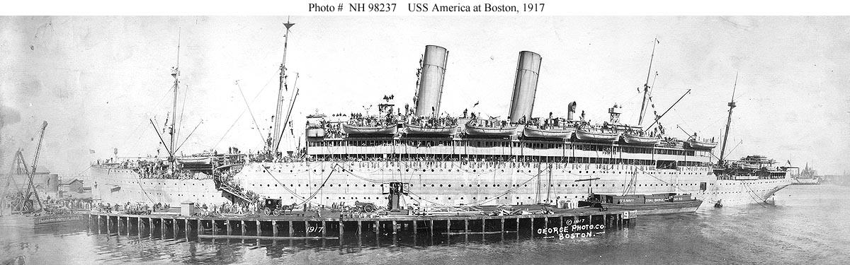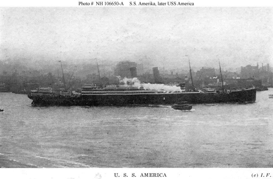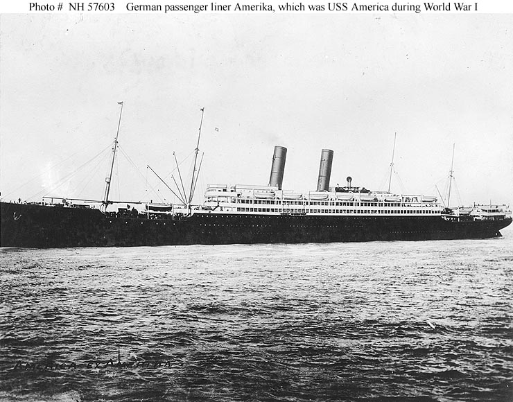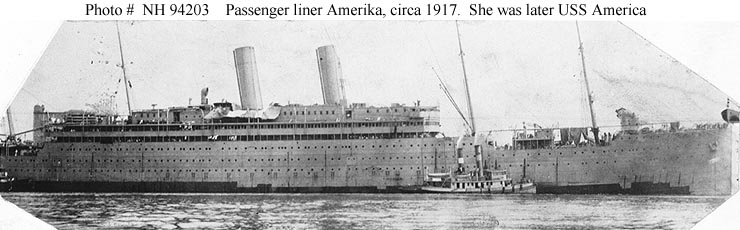 USS America, a 21,085-ton transport, was built at Belfast, Northern Ireland, as the German passenger liner Amerika. Completed in October 1905, she spent the next nine years on the Hamburg-America Line's service between Germany and the United States. She was caught at the western end of the route when World War I began in August 1914 and was laid up at Boston, Massachusetts, from then until the U.S. entered the conflict in April 1917. Seized at that time by American authorities, Amerika was turned over to the Navy for conversion to a troop transport. In August 1917, while this work was underway at the Boston Navy Yard, she was commissioned as USS Amerika, a name soon changed to America.