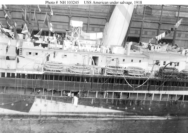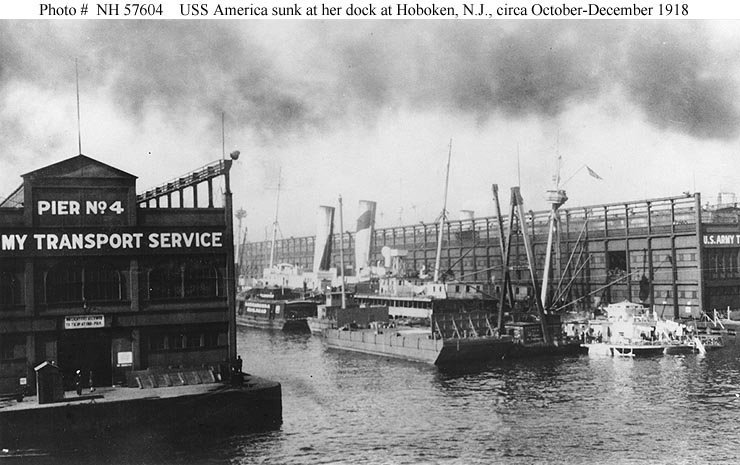 In late October 1917, America began active work for the Navy, carrying U.S. service personnel across the Atlantic to France. She was employed on this vital duty for almost the remainder of the First World War, making nine round-trip voyages. On 14 July 1918 her seventh eastbound crossing was briefly interrupted by a collision that sank the merchantman Instructor, but left America with slight damage. Her ninth trip to France was notable for a severe outbreak of influenza, which took the lives of more than fifty men. On 15 October 1918, just before departing for another trip, the transport accidently sank alongside her pier at Hoboken, New Jersey. Raised and repaired over the next four months, America returned to service in February 1919 to begin the first of eight round-trip voyages that brought nearly 47,000 Americans home from the former European war zone.