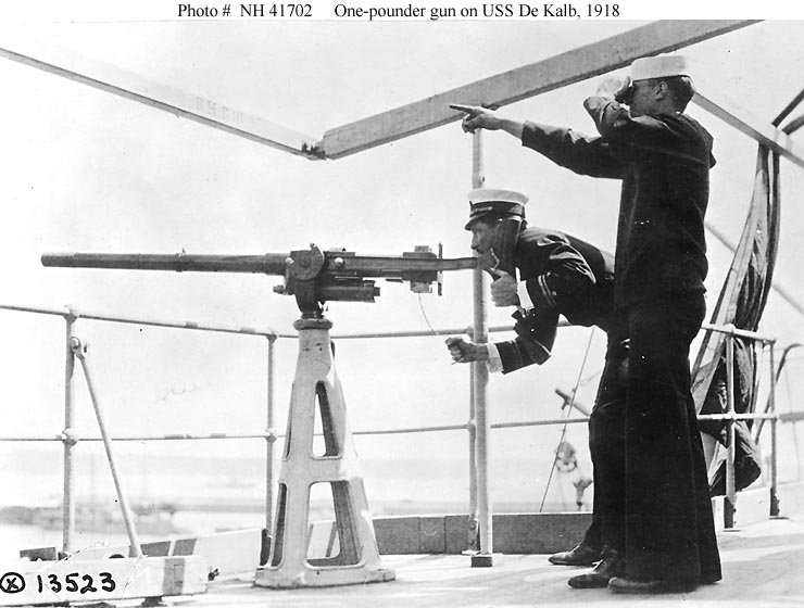 Photo #: NH 41702 USS DeKalb (ID # 3010) Officer firing a signal gun while a Sailor observes, 18 May 1918. The gun appears to be a 1-pounder Hotchkiss. U.S. Naval Historical Center Photograph. Online Image: 67KB; 740 x 560 pixels |