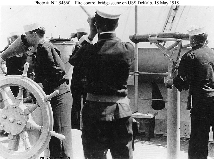 Photo #: NH 54660 USS DeKalb (ID # 3010) Scene on the ship's fire control bridge, 18 May 1918. Note man at speaking tube at left, officer with binoculars in the center, and telescope at right. U.S. Naval Historical Center Photograph. Online Image: 103KB; 740 x 550 pixels |